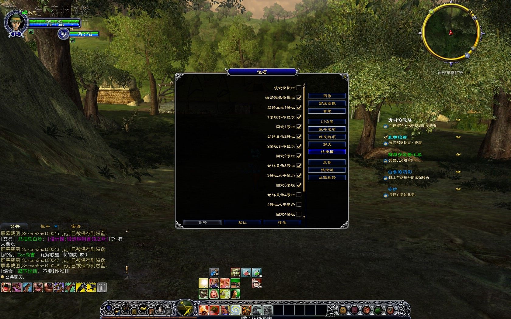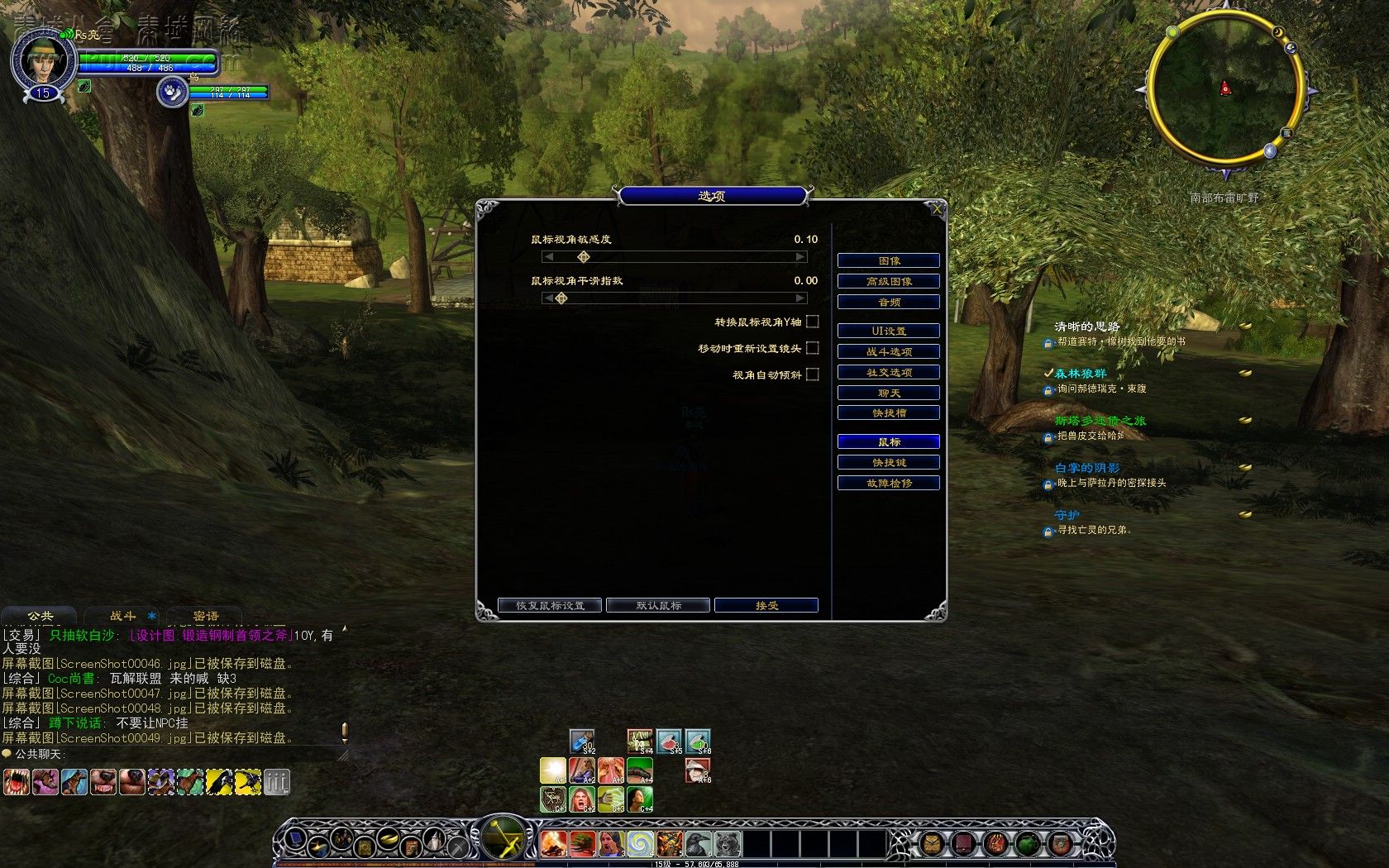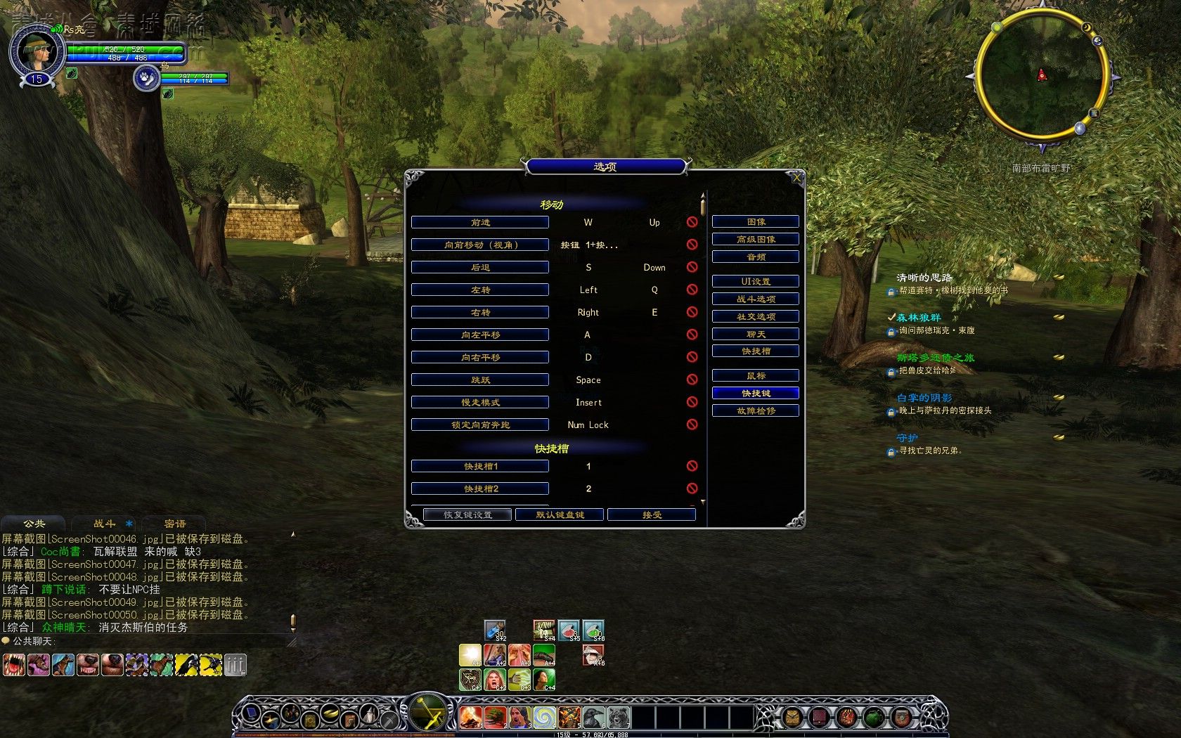 说到操作,键盘和鼠标是必不可少的。《指环王OL》的操作说简单其实很简单,只要是玩过魔兽世界的玩家,我想他们不到几分钟就可以上手了,因为《指环王OL》的操作和魔兽世界如出一辙。不过没玩过魔兽世界的玩家也没事,只要玩上1到2天,我相信你们也会很熟练的。《指环王OL》里面人物的走动是用键盘来实现的,分别是:QWEASD 这6个键,也可以使用上下左右那4个方向键来实现人物的走动。一些基本的操作:I键打开包袱,C键显示角色信息,K键显示技能,M键显示大地图`````